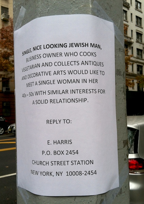 A reader of local blog WestsideRag sent in the tip after seeing the personals ad posted on West End Avenue somewhere in the mid-80s. The best part is that the only way you can respond is by sending Mr. Harris real, actual mail to a P.O. Box in the city. You’re only worthy of consideration if you are willing to send him a card, a letter, or some other creative postmarked item.